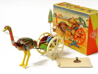 longueur 20 cm - en tôle lithographiée & plastique - mécanisme à clef (fonctionne) - en action, l'autruche tire la charrette en remuant la tête & les pattes - avec sachet contenant clef & ombrelle - 20 cm long - lithographed tinplate & plastic - wind-up mechanism in working condition) - in action, the ostrich pulls the chariot whilst moving his head & feet - with sachet containing key & parasol