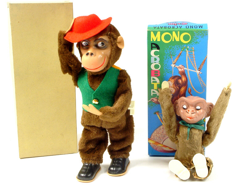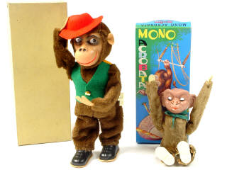 hauteur 23,5 cm - en plastique & tôle - moteur à ressort (fonctionne) - en action, le singe avance en pivotant sur lui-même tout en retirant son chapeau & en levant sa main droite - 23.5 cm tall - plastic & tinplate - clockwork mechanism (in working condition) - in action, the monkey moves forward whilst pivoting on himself, taking off his hat & raising his right arm