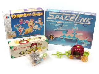 comprend : TOURNICOTTE LA SOURIS, SPACELINK (scellés) & THE MYSTERIOUS PUMPKIN COACH (sachet jamais ouvert) - boites en états 'b' à 'c' avec accrocs, frottements & traces d'humidité - on y retrouve les marques MB & VULLI