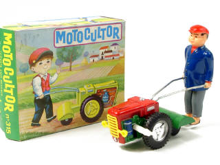 longueur 15,5 cm - en plastique - moteur à clef (fonctionne) - en action, le personnage avance tout en poussant sa machine - 15.5 cm long - plastic - wind-up mechanism (in working condition) - in action, the farmer pushes his motor cultivator