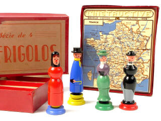 comprend 4 personnages en bois peint démontables en plusieurs éléments - petite déchirure sur l'étiquette du couvercle de boîte
