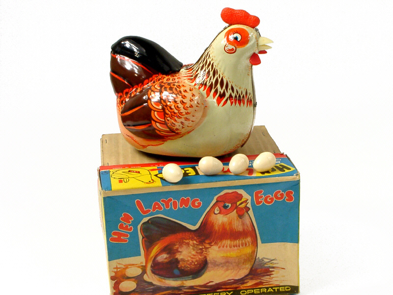 longueur 17 cm - en tôle lithographiée - moteur à piles (fonctionne) - en action, la poule tourne en rond en pondant ses oeufs (avec peine) tandis qu'elle caquette - avec 4 oeufs - 17 cm long - lithographed tinplate - battery operated (in working condition) - in action, the hen turns in a circle whilst laying eggs (with difficulty) - she clucks - with 4 eggs