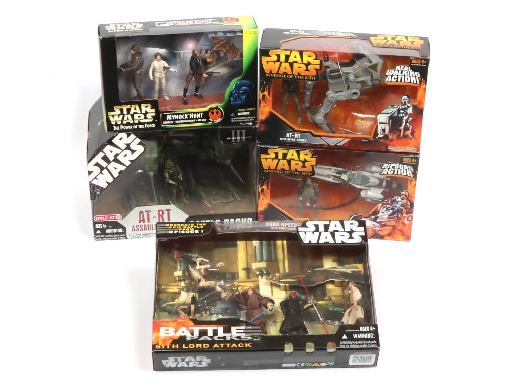 scellé - comprend : MYNOCK HUNT réf : 69650, AT-RT ASSAULTSQUAD réf : 87376, BARC SPEEDER réf : 85350, AT-RT réf : 85347 & set SITH LORD ATTACK réf : 87195 - on y retrouve les marques HASBRO & KENNER - boites avec petits accrocs & frottements