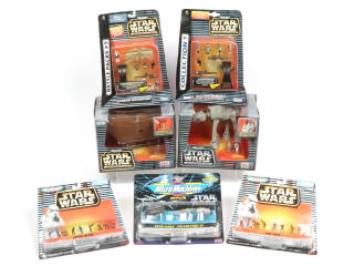 scellé - comprend : ENDOR ADVENTURE réf 68010, ALLIANCE REBELLE 96875, JAWA SANDCRAWLER réf : 96850, IMPERIAL AT-AT réf : 96843, IMPERIAL OFFICIERS, COLLECTION XI & REBEL PILOTS - on y retrouve les marques IDEAL & GALOOB - boites avec accrocs, frottements & petites déchirures
