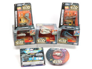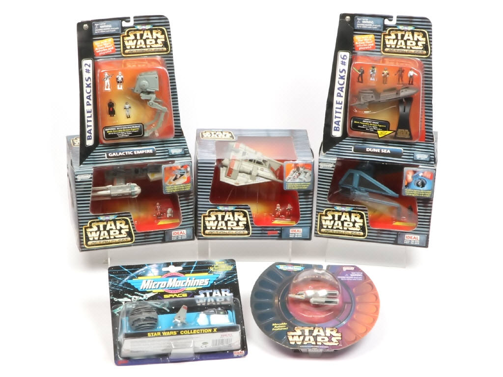 scellé - comprend : GALACTIC EMPIRE, DUNE SEA, Y-WING STARFIGHTER réf : 96847, REBEL SNOWSPEEDER réf : 96844, TIE INTERCEPTOR réf : 96849, COLLECTION X réf : 96607 & Y-WING STARFIGHTER réf : 66260 - on y retrouve les marques IDEAL & GALOOB - boites avec accrocs, frottements & petites déchirures