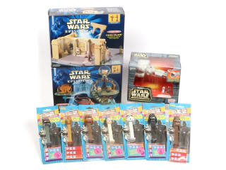 scellé - comprend : THEED PALACE réf : 79062, OTOH GUNGA réf : 79062, REBEL BLOCKADE RUNNER réf : 96869 & 7 PEZ (un blister décollé) - on y retrouve les marques IDEAL, PEZ & GALOOB - boites avec accrocs, frottements & petites déchirures