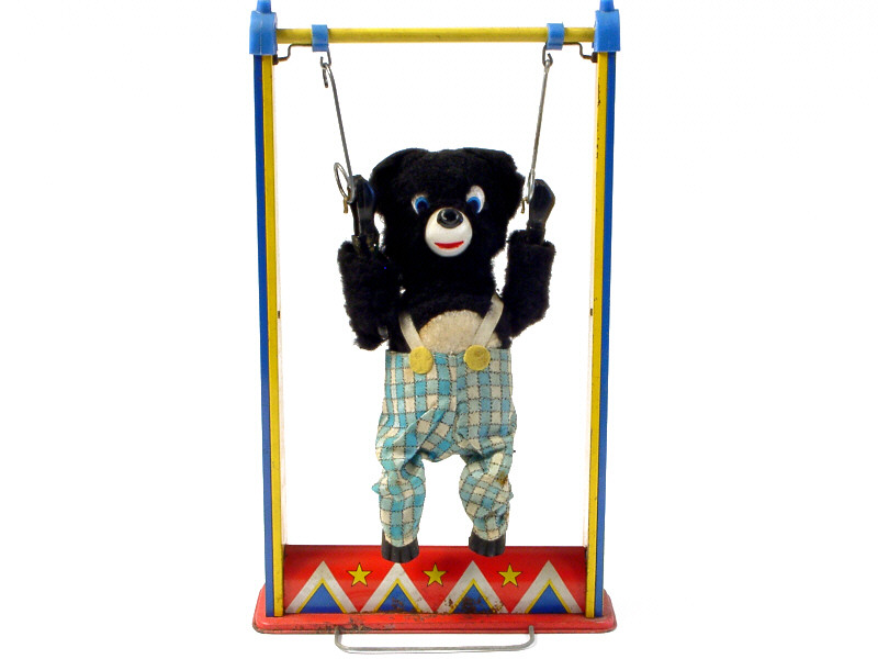 hauteur 36,5 cm - moteur à piles (à revoir) - en action, l'ours suspendu aux anneaux fait des acrobaties en avant ou en arrière - manque l'enseigne 'TEDDY BEAR SWING' - traces d'oxydation - un anneau non d'origine - 36.5 cm tall - battery operated (subject to verification) - in action, the bear performs forward & backward acrobatics - 'Teddy Bear Swing' sign missing - slight rust - one of the rings not original - SCARCE