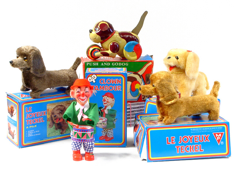 longueur 18 cm - moteur à inertie actionné par la queue de l'animal (fonctionne) - en action, le chien avance en faisant mine de courir après une balle - avec cale de boîte - 18 cm long - works by lowering the dog's tail then releasing it (in working condition) - in action, the dog chases after a ball - with box insert