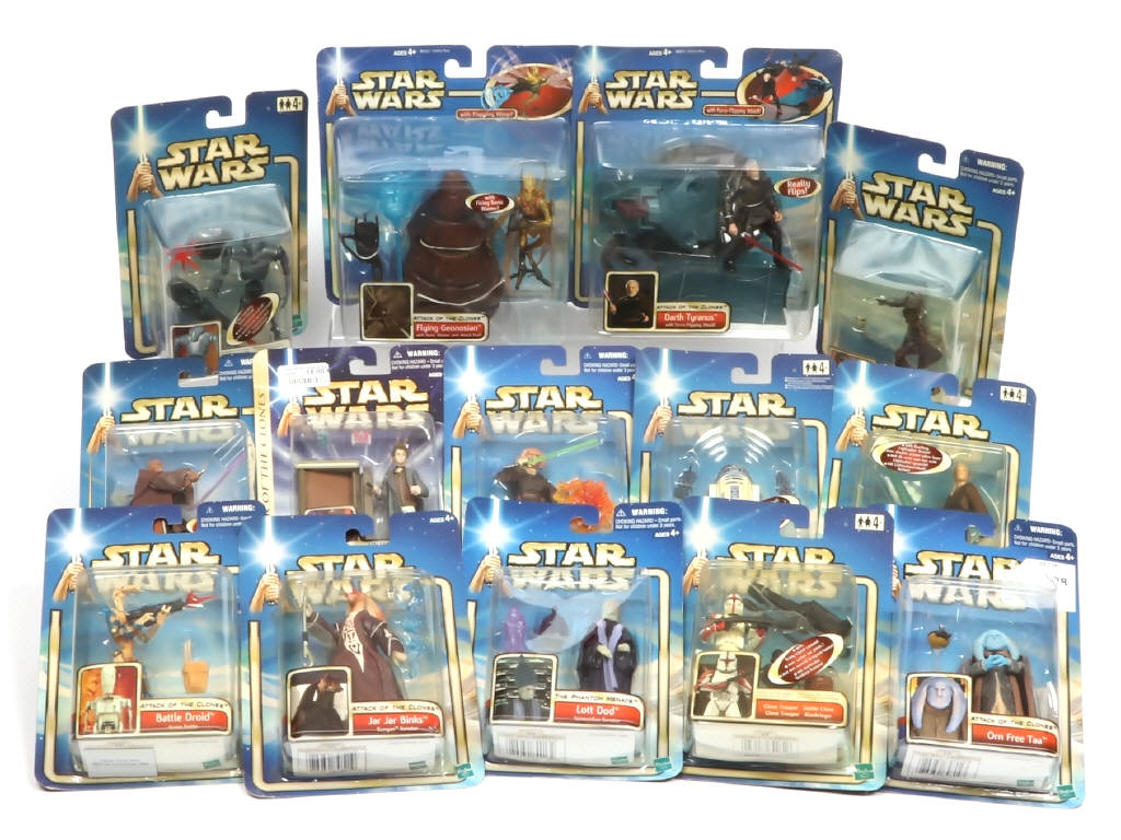 comprend notamment : FLYING GEONOSIAN, DARTH TYRANUS, LOTT DODO, ORN FREE TAA & JAR JAR BINKS - boites avec petits accrocs & frottements (3 étiquettes prix présentes & certains blister jaunis)