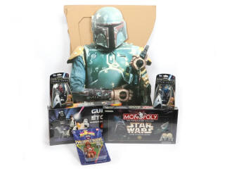 scellé - comprend : une PLV BOBA FETT grandeur nature, 2 figurines STAR TREK (SPOCK réf : 61759 & SCOTTY réf : 61761), 1 figurine POWER RANGERS (SLOTSKY réf : 2464 - blister décollé), MONOPOLY STAR WARS & JEU INTERACTIF LA GUERRE DES ETOILES (scellés) - boites avec accrocs, manques de papier & frottements - on y retrouve les marques BANDAI, PLAYMATES TOYS & PARKER