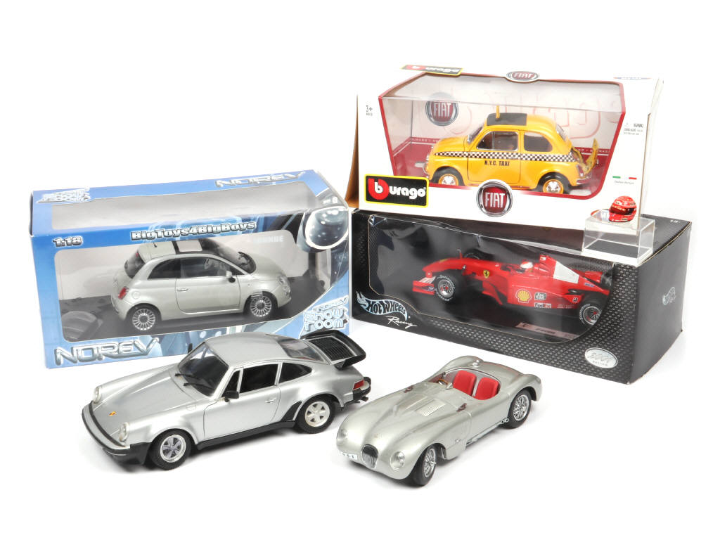 échelle 1/18ème - comprend les modèles : PORSCHE, JAGUAR (pare-brise cassé & manquant), FERRARI & FIAT (dont une avec antenne recollée)- on y retrouve les marques : AUTOART, POLISTIL, BBURAGO, NOREV & MATTEL - on y joint un casque de M.SCHUMACHER (année 2000) - 3 modèles en boite (état 'b')