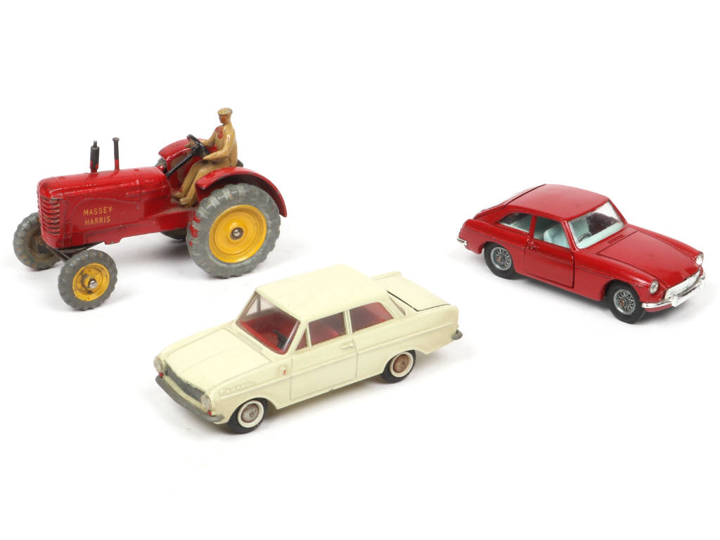 comprend : OPEL KADETT (avec roue de secours, petits détails de peinture ajoutés), MGB GT (avec valise) & tracteur agricole MASSEY-HARRIS - pneus séchés - on y retrouve les marques : TEKNO (DANEMARK), CORGI TOYS & DINKY TOYS (GB)