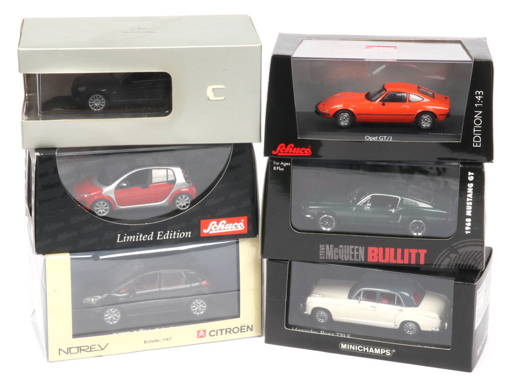miniatures reproduisant les modèles : SMART FORFOUR (une fêlure sur le couvercle de boîte), CITROËN C4 PICASSO, MERCEDES KLASS C (suremballage taché), 220S, OPEL GT/J & FORD MUSTANG - on y retrouve les marques : NOREV, YAT MING, SCHUCO & MINICHAMPS