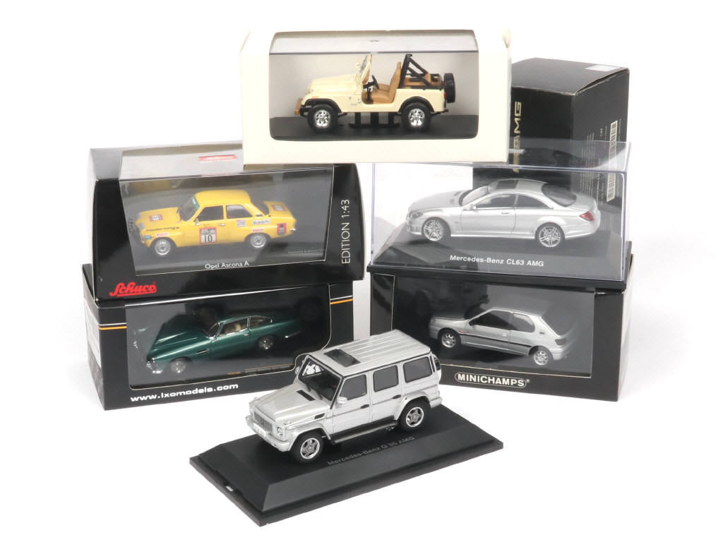 comprend : MERCEDES G55 AMG, CL63 AMG, OPEL ASCONA, JEEP CJ-7 LAREDO, ASTON MARTIN DB4 & PEUGEOT 306 XS (suremballage non conforme) - on y retrouve notamment les marques : MINICHAMPS, AUTOART, IXO & SCHUCO - un exemplaire sans suremballage