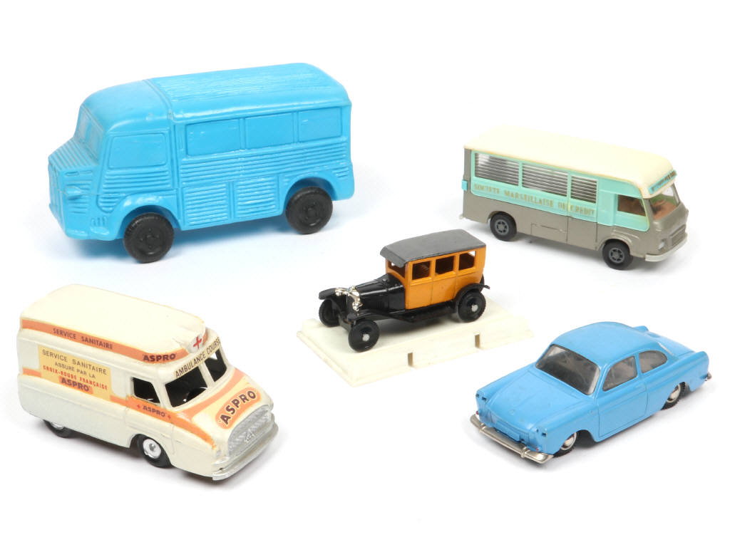 différentes compositions - comprend notamment les modèles : CITROEN (dont un modèle en partie repeint & vis de plancher non d'origine), VOLKSWAGEN (moteur à clef fonctionnel - manque optiques de phares - une vis de plancher non d'origine) & RENAULT - on y retrouve notamment les marques : SALZA, DUX, SAFIR & CLE