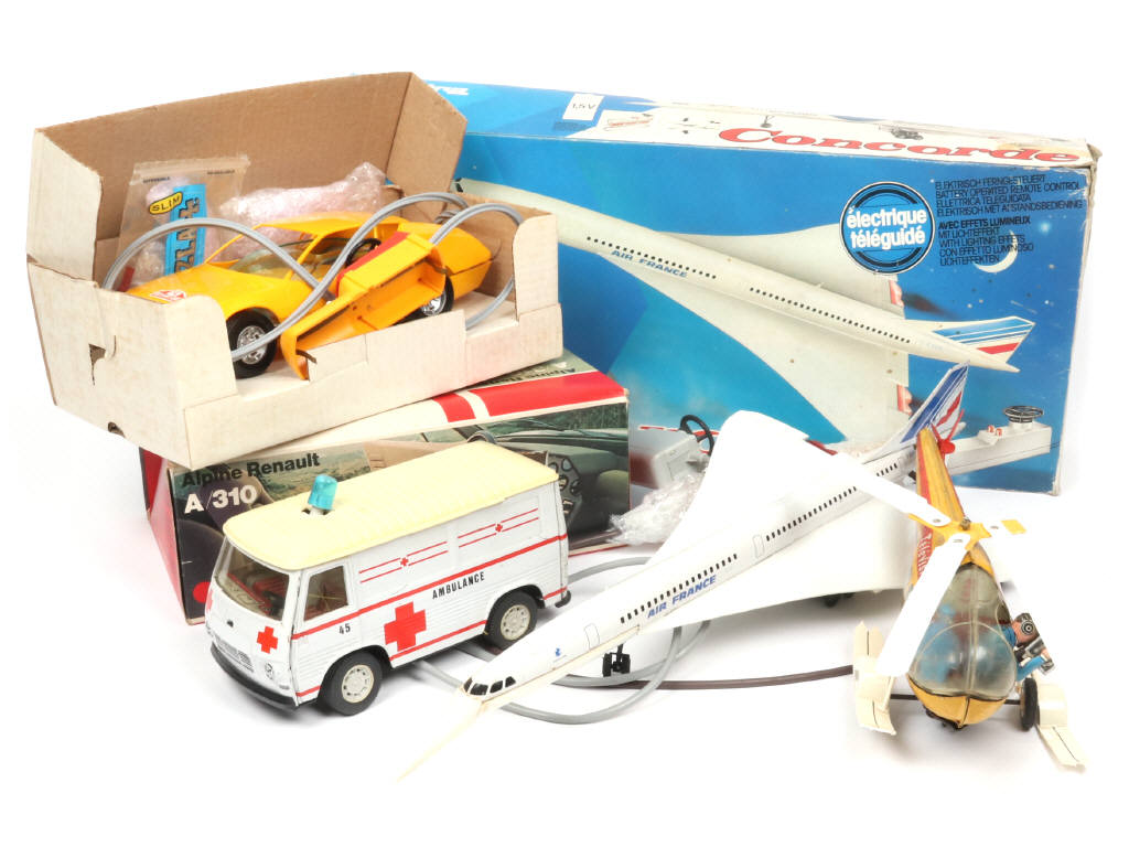 grandes échelles - comprend : PEUGEOT J7 'AMBULANCE' téléguidé (moteur à revoir), CONCORDE (boîte en état 'c', importantes déchirures) & hélicoptère 'TELEVISION' (restaurations, éléments repeints & non d'origine - on y joint une ALPINE A310 téléguidée (moteur à revoir, nombreuses parties désolidarisées) de la marque MONTBLANC - avec manques