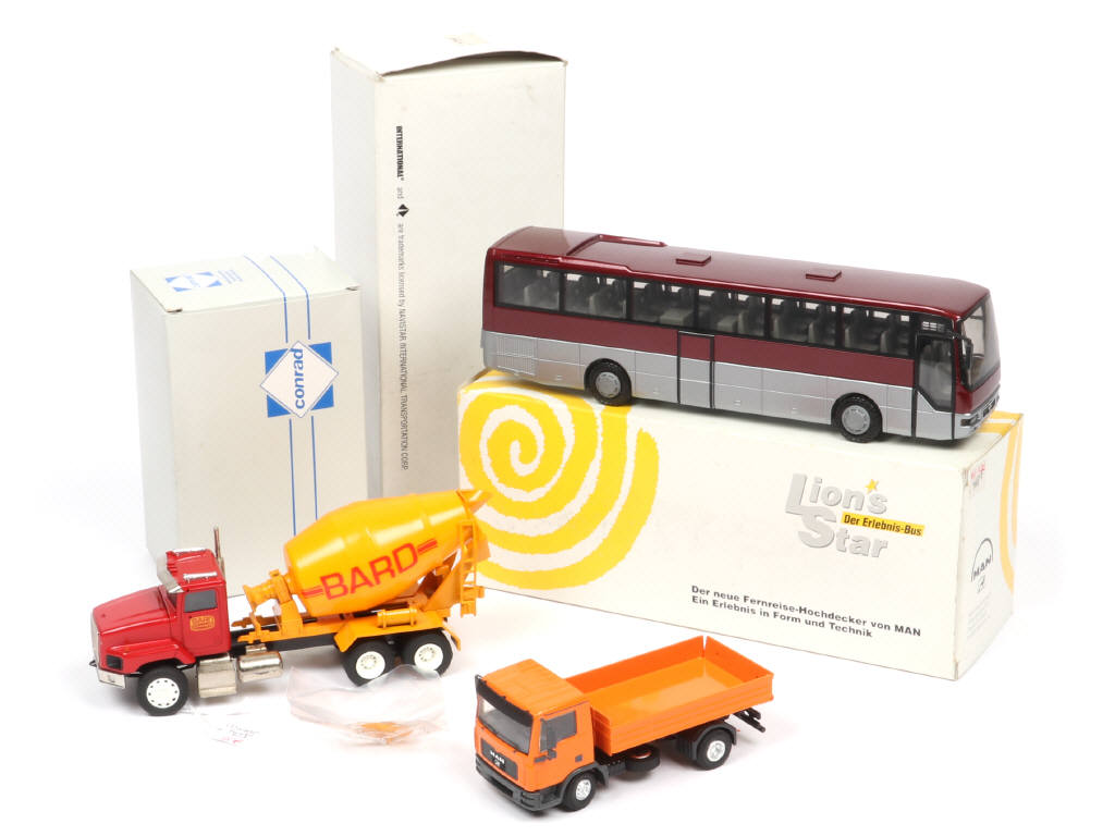 comprend les modèles : INTERNATIONNAL (accessoires sous sachet - quelques micro-éclats) & MAN - boites en état 'b' avec quelques petits manques de papier & étiquettes sur certains rabats (un exemplaire avec taches d'humidité)
