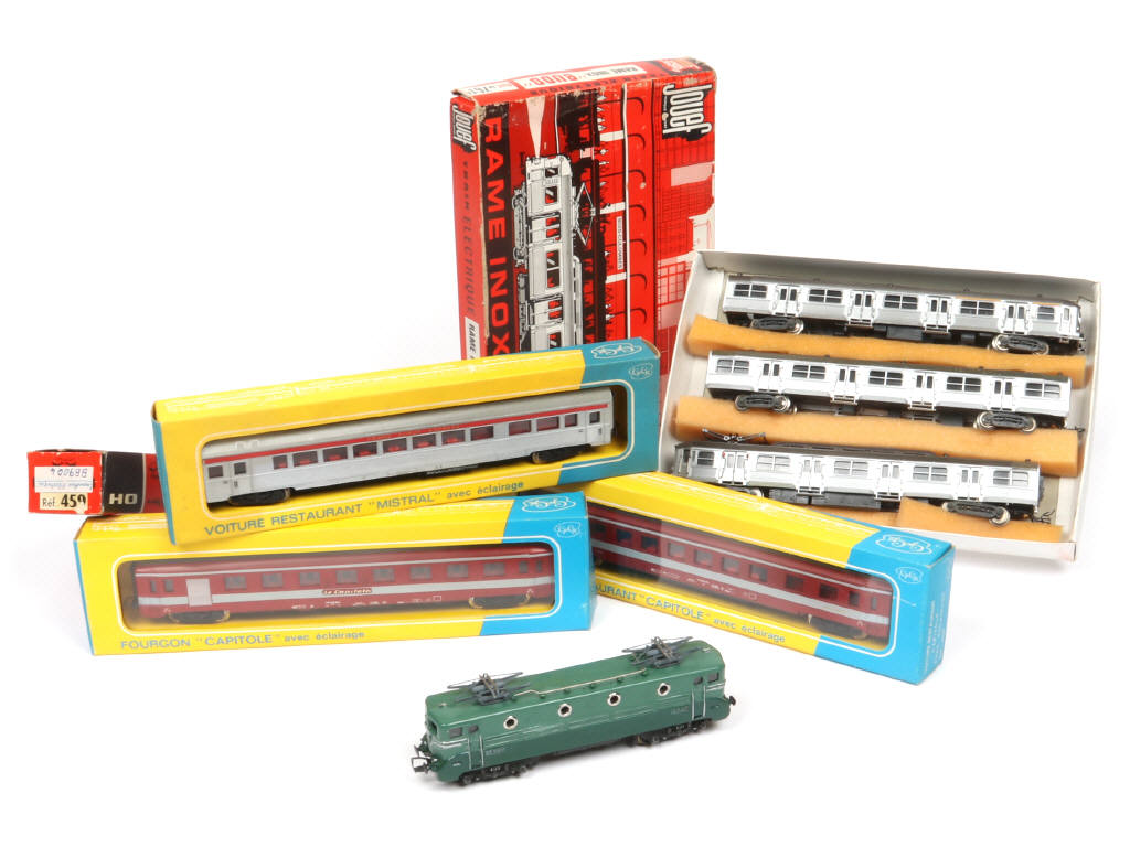 non testé - on y retrouve les marques : locomotive type BB-9004, coffret rame inox 'BUDD' (référence 761E - toits repeints), voiture-restaurant & fourgon 'LE CAPITOLE' & voiture-restraurant 'LE MISTRAL' - on y retrouve les marques : GEGE & JOUEF - boites en état 'b' à 'd'