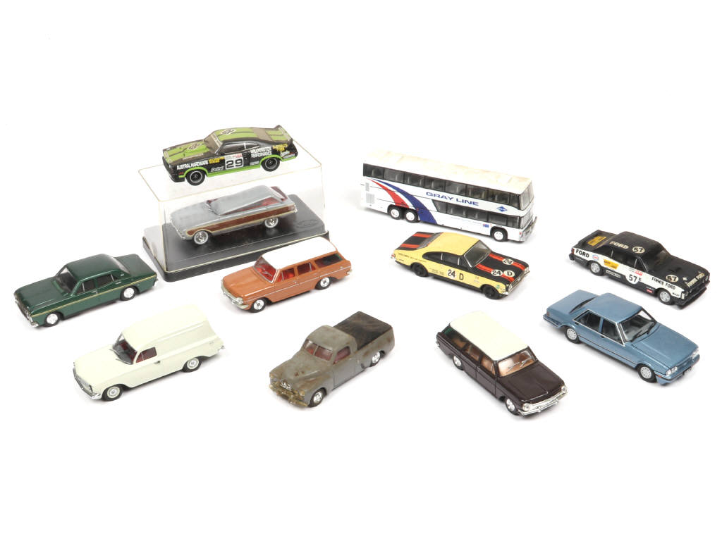 modèles plus ou moins encrassés - comprend notamment les modèles : HOLDEN & FORD - possibilité de quelques manques (un exemplaire cassé & incomplet) - on y joint un autocar DENNING de la marque TRUX