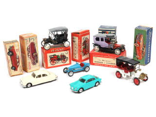 comprend : JAGUAR 2,4L, ALFA ROMEO GIULIETTA, PANHARD JEVASSOR, FORD, N.A.G. PHAETON & BUGATTI - on y retrouve les marques : NOREV, ZISS & J.M.K - on y joint une boite vide FORD VEDETTE de la marque NOREV (petits accrocs, petites déchirures & déformations) - boites en états 'b' à 'c'