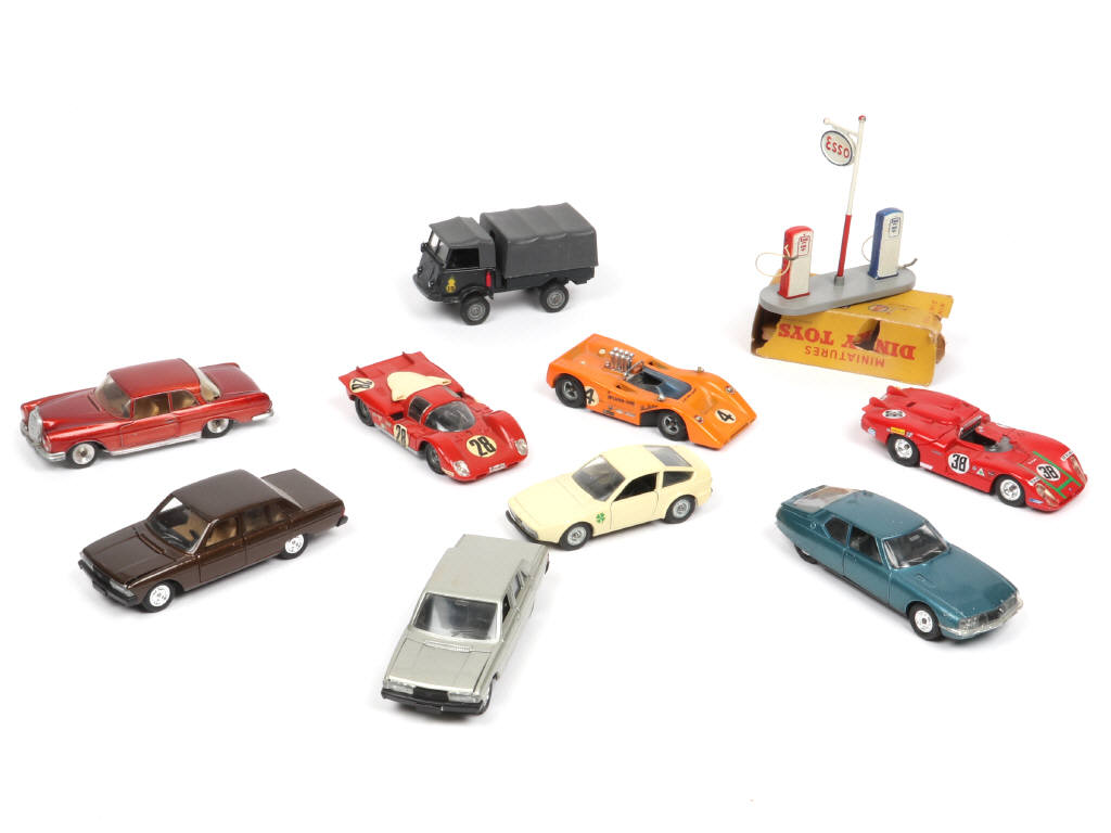 comprend notamment les modèles : RENAULT (VERSION PEU COURANTE), MERCEDES (petite cassures sur la vitre arrière), PEUGEOT, CITROEN, FERRARI & Mc LAREN - on y joint un poste essence de la marque DINKY TOYS en état 'B.d'