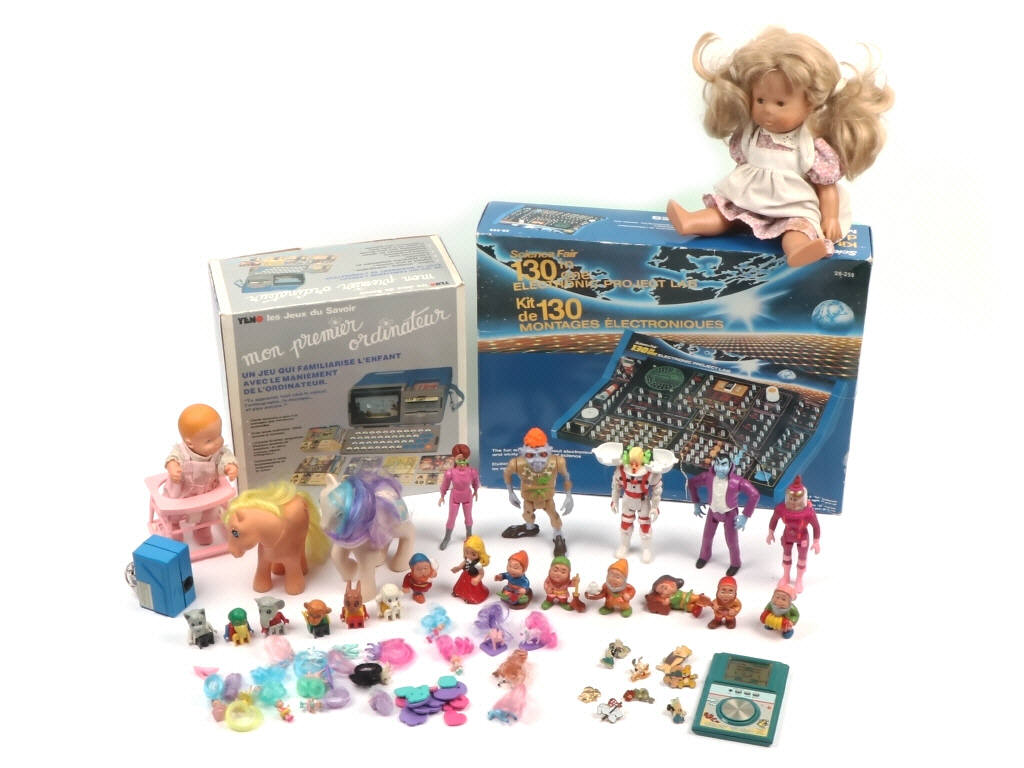 comprend notamment : MON PREMIER ORDINATEUR (cache piles oxydé), 2 PETITS PONEYS, 5 figurines GHOSTBUSTERS, KIT DE MONTAGE ELECTRONIQUE (non testé) & 8 PINS - ensemble plus ou moins encrassé - avec manques & parties cassées - on y retrouve les marques HASBRO, KENNER & YENO