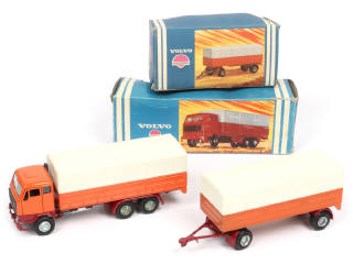 NACORAL (ESPAGNE) 201-202 VOLVO Plateau à ridelles bâché avec remorque bâchée orange, grenat & blanc