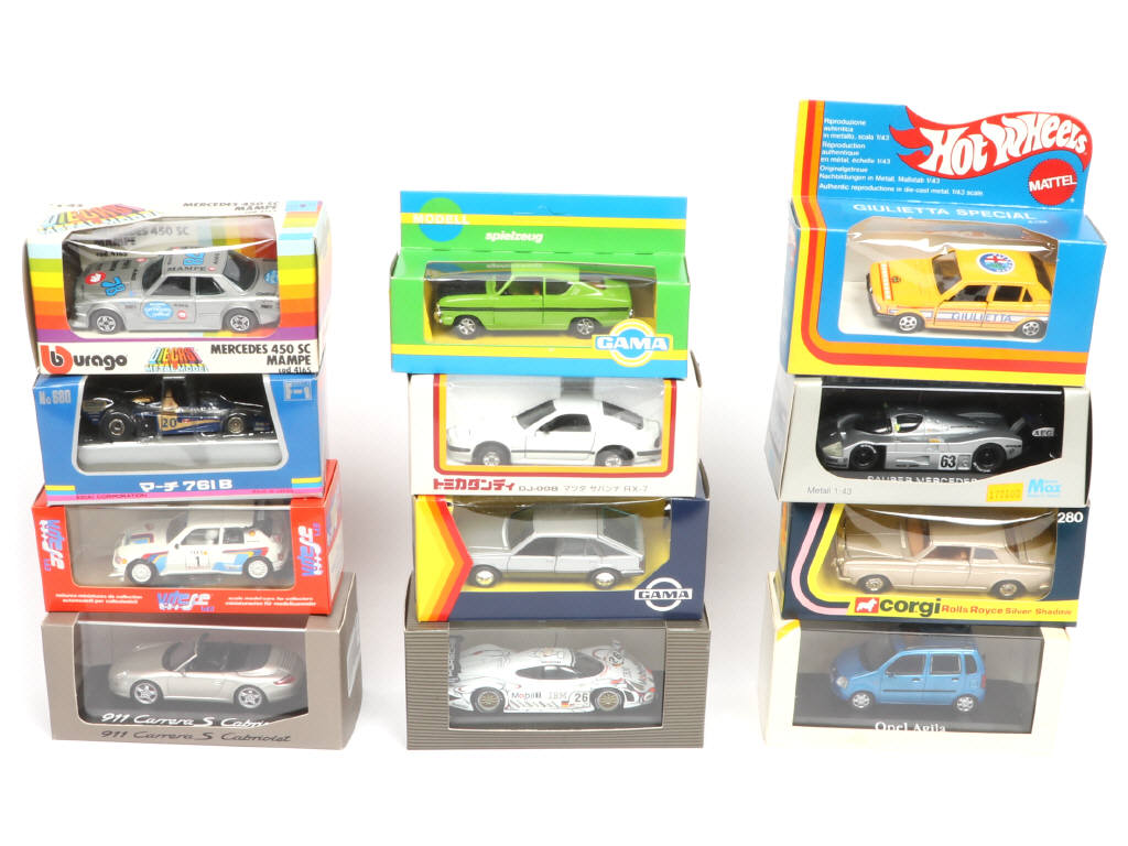 comprend notamment les marques : GAMA, VITESSE, CORGI, HOT WHEELS & TOMICA DANDY - on y retrouve notamment les modèles : OPEL KADETT COUPÉ, PEUGEOT 205 TURBO 16 & MERCEDES 450 SC - boîtes en états 'a' à 'c'