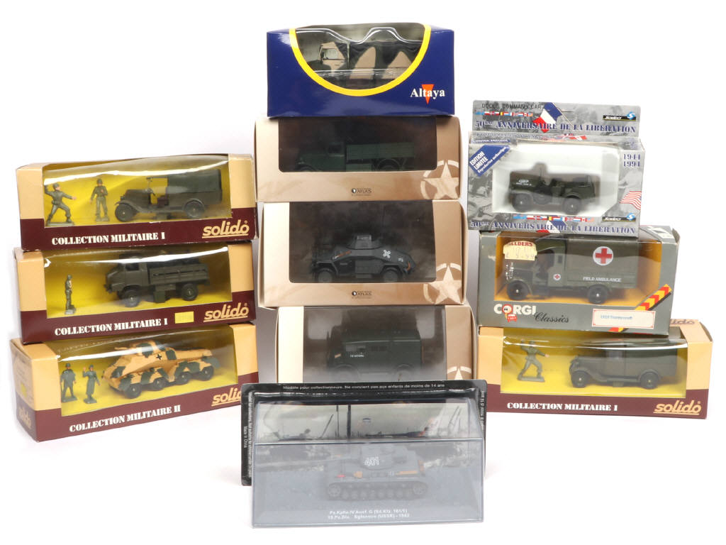 comprend notamment les marques : SOLIDO, CORGI & ATLAS - on y retrouve notamment les modèles : DODGE COMMAND CAR, RENAULT BACHE & CITROËN TYPE 23 - boîtes en états 'b' à 'd'