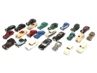 miniatures reproduisant notamment les modèles : PEUGEOT 402, PEUGEOT 302 & JAGUAR - certaines carrosseries encrassées - possibilité de petits manques & parties cassées