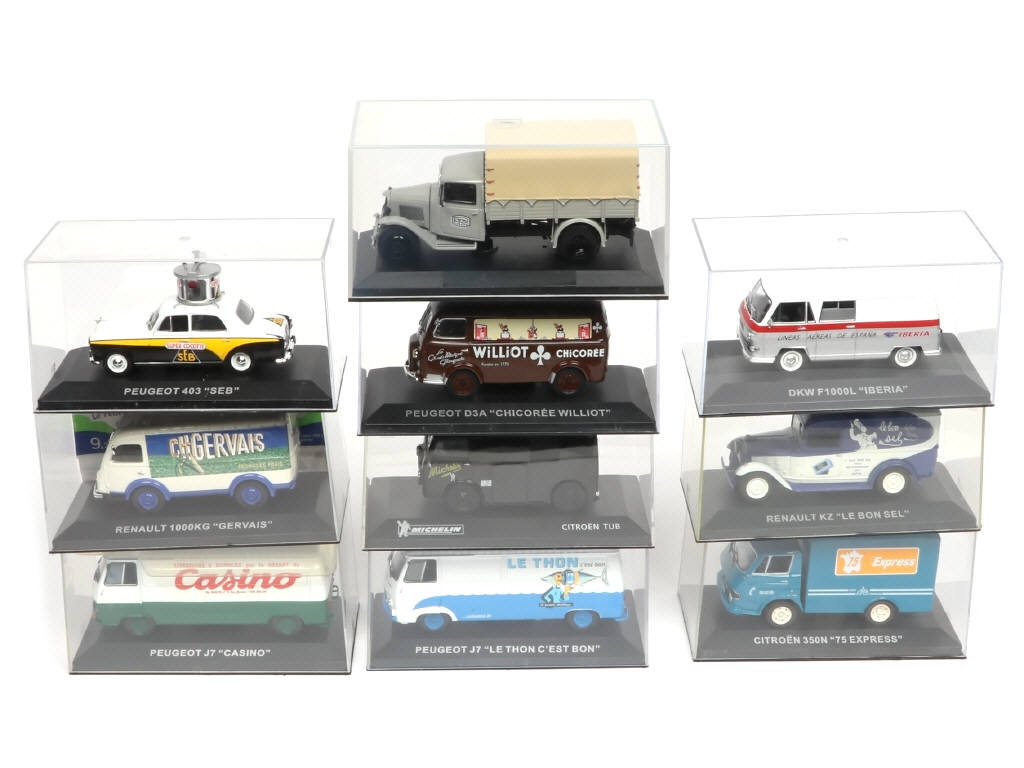 comprend notamment les modèles : RENAULT 1000KG "GERVAIS", DKW F1000L "IBERIA" & PEUGEOT J7 "CASINO" - boîtes légèrement poussièreuses
