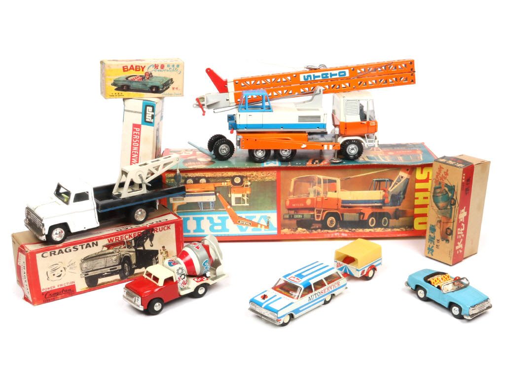 longueur du plus grand 30 cm - 4 modèles avec moteur à friction (fonctionnels) - boites en états 'b' & 'd' - on y retrouve notamment les marques : EHRI & CRAGSTAN (NGS JAPAN) - possibilité de quelques éléments manquants