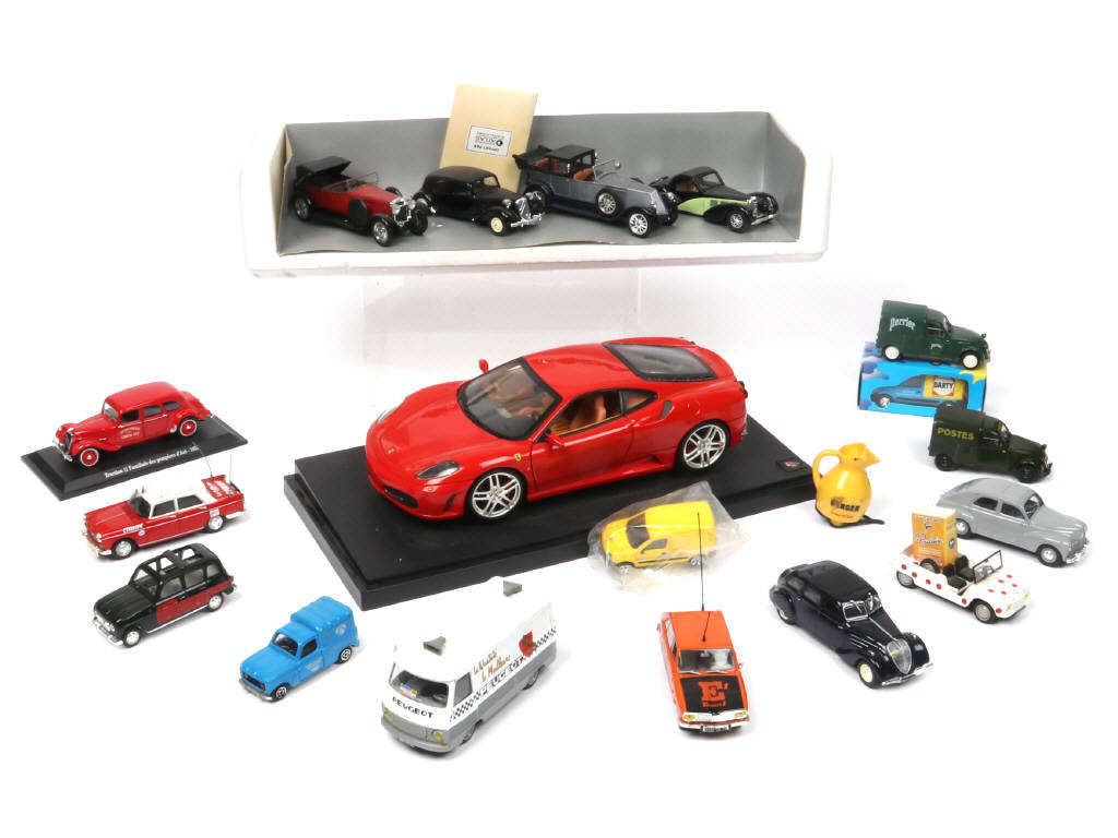 comprend notamment les modèles : RENAULT, PEUGEOT, CITROEN & FERRARI - on y retrouve notamment les marques : HOTWHEELS, ÉDITIONS ATLAS, NOREV & MAJORETTE - possibilité de petits manques & parties cassées