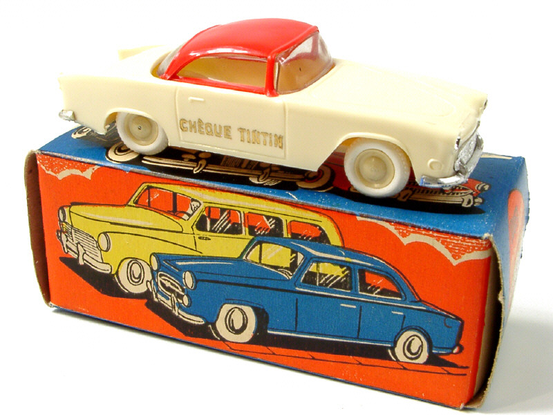 avec phares diamant - la mention 'CHEQUE TINTIN' est gravée en lettres dorées sur le côté droit de la voiture - ce modèle promotionnel pouvait être obtenu en échange de points que l'on trouvait à l'époque dans le journal de TINTIN - avec petite étiquette 'SERIE COLLECTION LUXE' collée sur l'un des rabats de la boîte - une petite fêlure sur le bas de caisse gauche