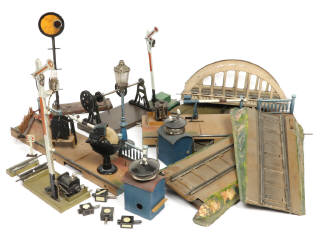 écartements 'O' & 'I' - certains mécanismes non testés & d'autres fonctionnels - on y retrouve les marques : MÄRKLIN & BING - quelques éléments cassés, manquants & repeints (suivant les exemplaires) - on y joint une meule, une machine outil & un réverbère