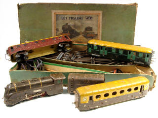 contient : une locomotive à vapeur type 222 avec tender, une voiture de voyageurs de 2ème classe, un fourgon à bagages, un fourgon postal, un passage à niveau, un heurtoir, un transformateur type 546 avec lampe (manque ampoule), 18 rails & un croisement - avec manques - parties repeintes sur les wagons