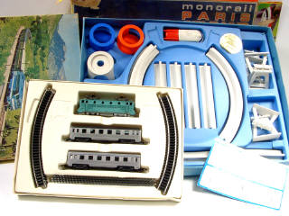 contient : une motrice monorail avec moteur à piles (à revoir), 6 monorails courbes, 4 monorails droits, 4 monorails ondulés, 8 piliers, 7 éléments d'architecture, un drapeau français & une notice incomplète - manque un drapeau - dessus de la cabine de la motrice légèrement fondue - il s'agit d'une reproduction du célèbre aérotrain conçu par Jean Bertin à la fin des années 1960 qui devait relier Paris à Orléans en un temps record - ce projet avorta à la fin des années 1970 & seuls subsistent les monorails en béton que l'on aperçoit le long de la ligne ferroviaire - PEU COURANT !