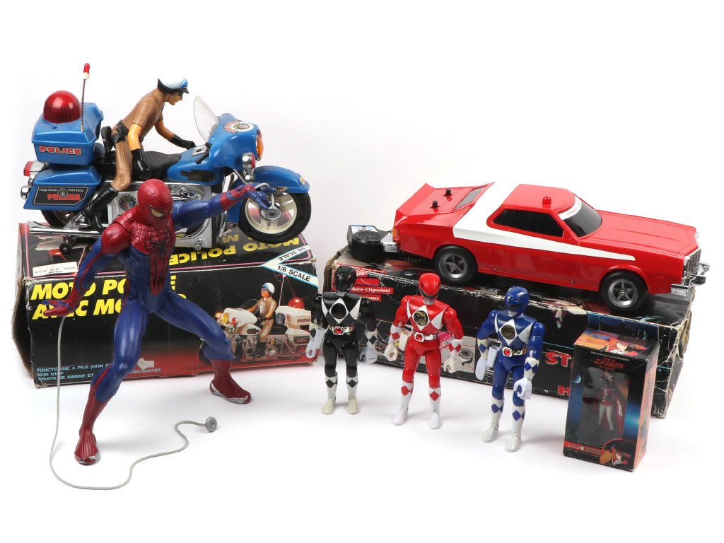 comprend : 3 figurines POWER RANGERS de 1994 (21 cm de hauteur), moto de police de 1980 trappe à piles oxydée), une figurine SPIDERMAN (testé fonctionne - 32 cm de haut), voiture STARKY & HUTCH (ne s'allume pas) & une figurine QUEEN EMERALDAS (blister de boite déchiré) - avec manques & parties cassées - les boites sont en états de 'b' à 'd' - on y retrouve les marques BANDAI, ABLE CORPORATION & WEYMM'S CIE