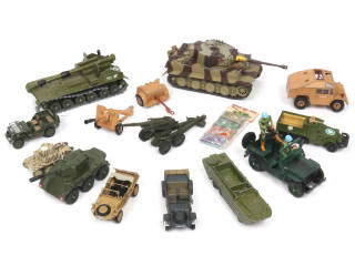 on y retrouve notamment les marques : CORGI TOYS, DINKY TOYS & BRITAINS - quelques petits manques & parties cassées - on y joint un sachet de 4 chars de combat en tôle de production japonaise