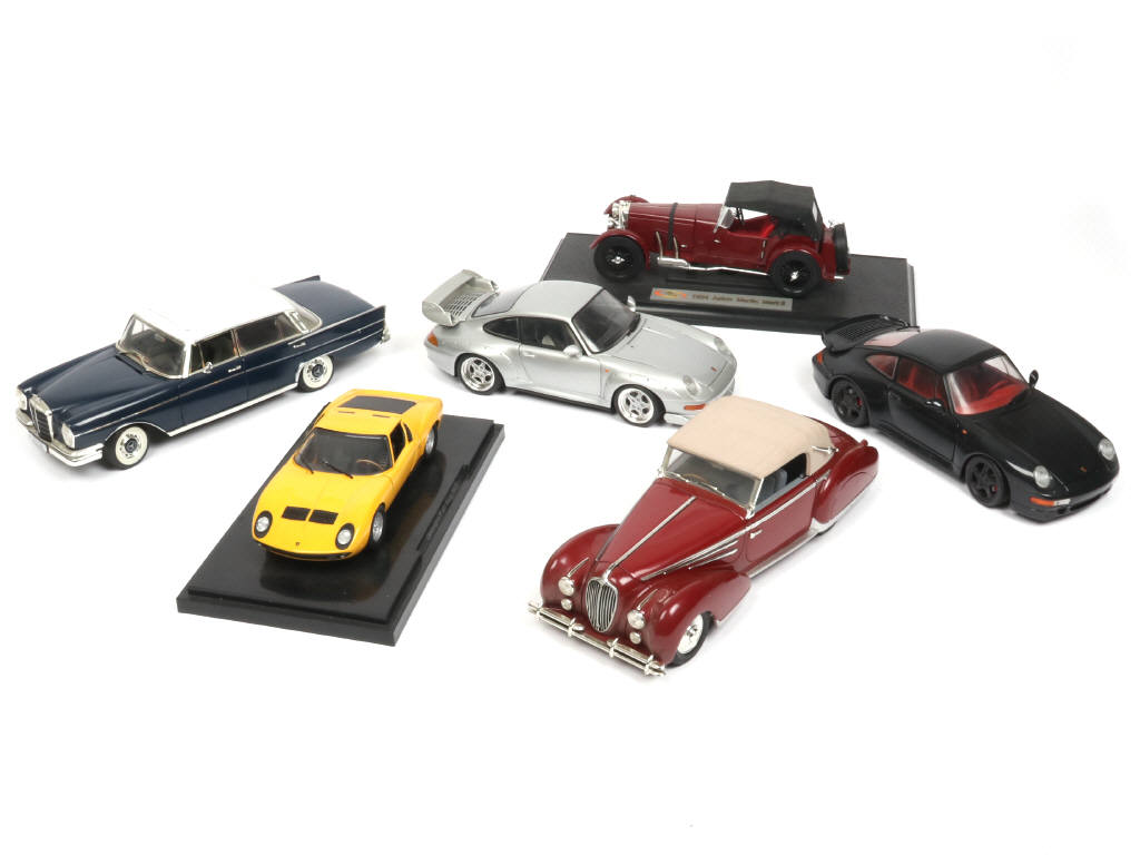 grandes échelles - miniatures reproduisant notamment les modèles : MERCEDES, PORSCHE & ASTON MARTIN - on y retrouve notamment les marques : UT MODELS & REVELL - quelques petits accessoires manquants & légères restaurations (suivant les modèles)