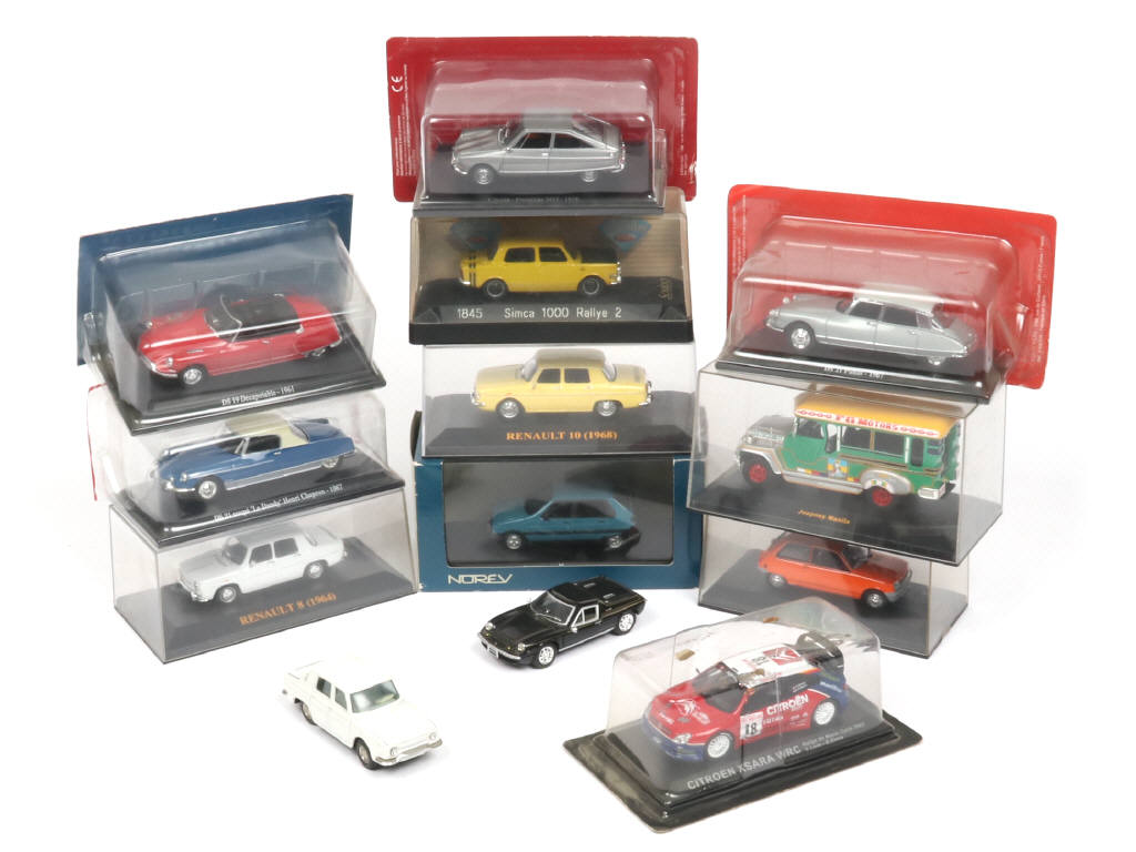 exemplaires vendus principalement en kiosque - miniatures reproduisant notamment les modèles : CITROËN, RENAULT (un exemplaire en état 'A-') & JEEP - on y retrouve notamment les marques : NOREV, SOLIDO & HONGWELL - 2 exemplaires sans boîte
