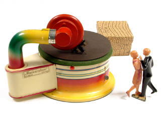 longueur 19 cm - moteur à clef (fonctionne) - plateau en métal - une partie du phonographe recollé - on y joint un couple de danseurs en celluloïd - 19 cm long - wind-up mechanism (in working condition) - metal plate - one part of the gramophone re-glued - we have added a celluloïd dancing couple - SCARCE