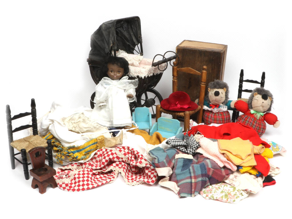 Lot comprenant landau en fer et bois noirci (32 x 39) – chaises paillées et lot de vêtements divers de fabrication maison.