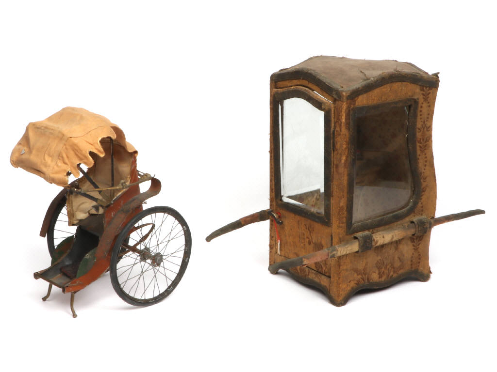 Diminutif de chaise à porteur, complète, en bois et tissu, trois cotés avec verre biseauté, en bois et tissu, 19ème siècle. 31 x 18 x 17. Partie de pousse-pousse en tôle peinte, fabrication 1900, roues non d’origine. 27 x 19.
