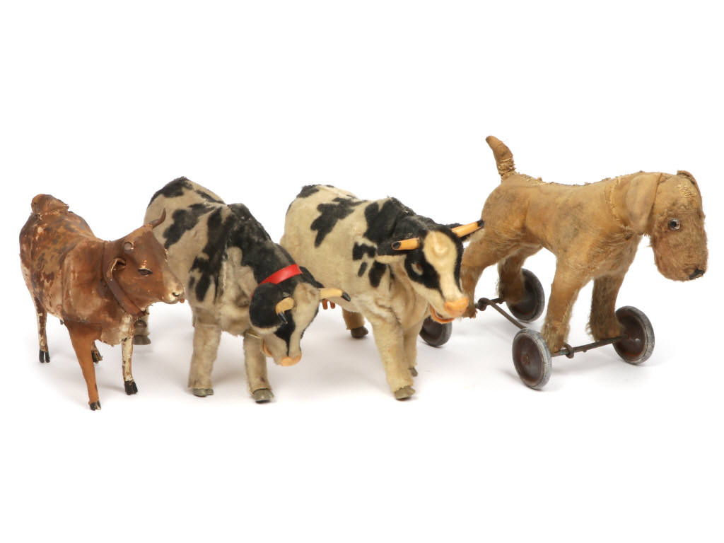 Dont vache en carton recouvert de peau et système de réservoir au niveau du pie, le rendant fonctionnel, L=31cm. Deux vaches laitières à batterie, en tôle recouverte de velours, L=32cm. Chien en peluche, à roulettes, L=35cm.