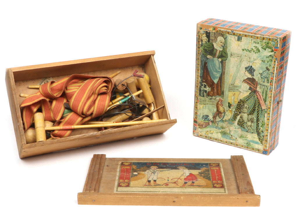 Deux jeux de société dont petit jeu de croquet de salon et jeu de cubes à décors d’enfants – de scènes paysannes et de fables.