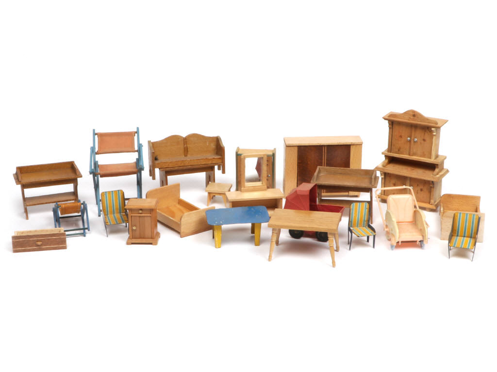 Intérieur de cuisine en bois et papier collé, avec cabinet de toilette. 83 x 41 x 41. Intérieur de maison en bois et papier collé. 68 x 34 x 39. Nous y joignons quelques éléments de mobilier en bois – pupitre – buffet et lit.