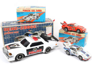 longueur de la plus grande : 41 cm - en plastique & en tôle - moteurs à piles (non testés) - comprend les modèles : PORSCHE & MERCEDES - boites en état 'b' - on y retrouve notamment la marque TAIYO