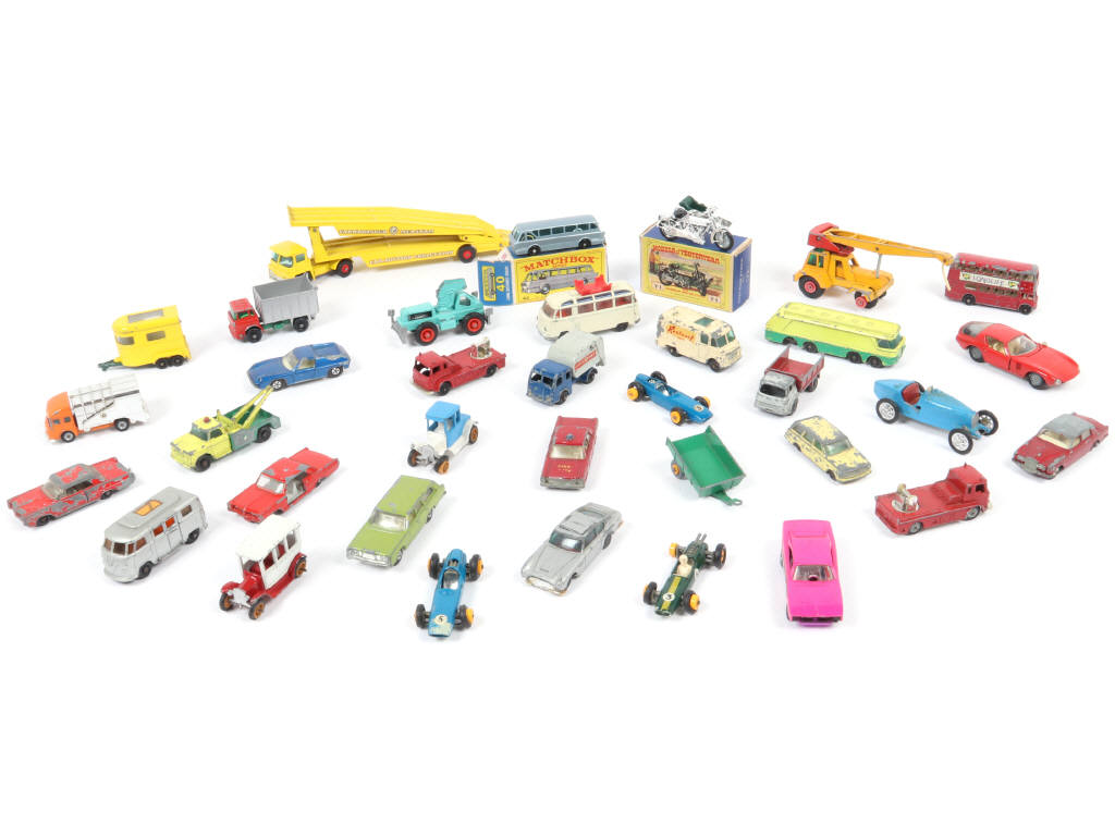 comprend notamment les modèles : ROYAL TIGER, SUNBEAM, WARRIOR, VOLKSWAGEN, ALFA ROMEO & MERCURY - on y retrouve notamment les marques : MATCHBOX, CORGI, JOAL, HUSKY & SIKU - avec manques & parties cassées - 2 boites en état 'b'