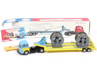 C.I.J./NOREV (FRANCE) 4/75/00 SOMUA Semi-remorque surbaissée porte-bobines de câbles bleu, jaune & noir